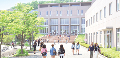 緑の丘に建つ日高キャンパスは、’99年に誕生したきれいなキャンパスです。クヌギの林や小川のせせらぎが聞こえる心地良い学習環境が自慢です。最先端の設備を整えるモダンな校舎群とともに知性や人間性を伸びやかに育み、2年間の有意義な学生生活を創ります。