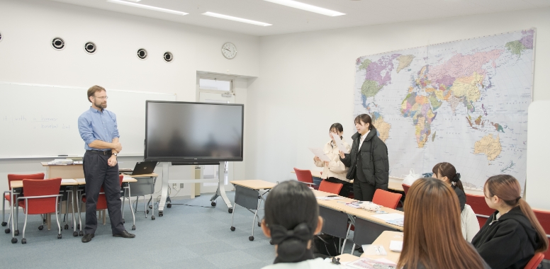 コミュニケーションスペースと呼ばれる、英会話特別教室。アメリカンスタイルの授業では英語での会話も盛り上がり、笑い声もアメリカン?!