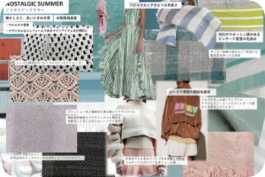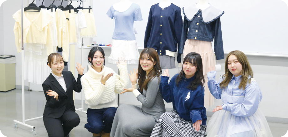 校外学習で、アパレル企業、OEM、ODMメーカー、アパレル小付属メーカー、服飾資材コンバーターに行き、業務内容を学びます。展開月ごとのスタイリングやシーズンテーマを検討して、スタイリングマップを作成後、縫製工場との打ち合わせ(素材、付属などの確認)を経てオリジナルブランドの服を製作します。その後、販売計画(販促計画、利益計画)まで考えるプロジェクトです。