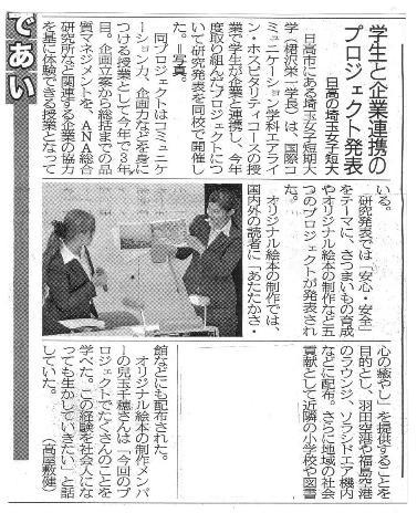 エアライン・ホスピタリティコースの卒業発表の模様が埼玉新聞で紹介されました 2013.02.18 エアライン・ホスピタリティコース2年生の卒業発表の模様が、埼玉新聞(2013年2月13日)で紹介されました。 一覧へ戻る