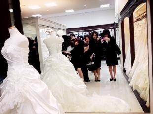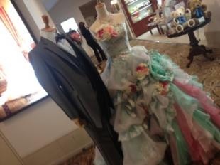憧れの純白のウエディングドレスとお花やフリルたっぷりのカラードレスが私達を迎えてくれました。どれも素敵で『カワイイ!』を連発、スタッフの方々から花嫁のドレスのみならず新郎の衣装、また和装などたくさんの知識を教えて頂きました。スタッフの皆さんは全員スタイリストのライセンスを持っていらっしゃるそうで、学生たちも学ぶことが沢山あることを知りました。