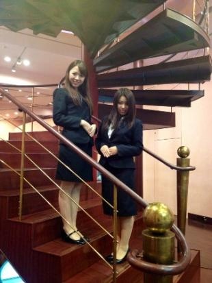 ホテルとは違ってアットホームな雰囲気の中で、自分達だけの結婚式を希望するカップルがたくさんこちらで挙式と披露宴を行うそうです。ペット同伴の結婚式が出来ると言うことをお聞きして驚きました。学生たちもさっそく1階の螺旋階段の元、静々と下りてくる花嫁の気持ちになってみました。階上には花嫁の可愛いお部屋もあり、人生最高の瞬間を待つ花嫁の気持ちを想像しました。