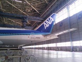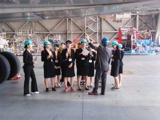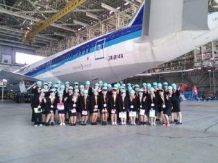 エアライン・ホスピタリティコースでは、「エアラインビジネス」の科目の一環として、2014年4月26日(土)、羽田空港の新整備場地区にあるANA 機体メンテナンスセンターと安全教育施設での学外授業を実施しました。