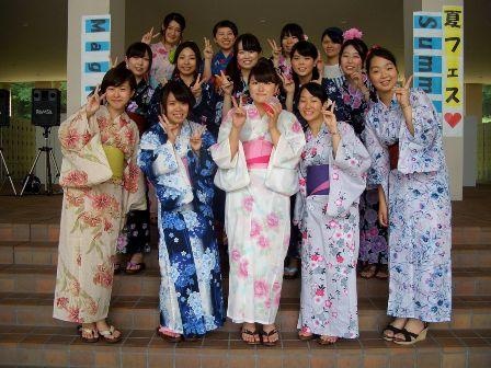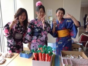 足立先生とブライダル・コーディネートコース生による着付けブースも開設され、キャンパスは色とりどりの浴衣美人に溢れました。