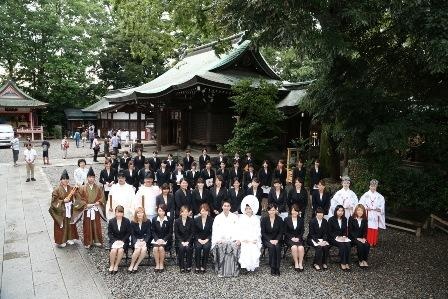 挙式後、神職の方、巫女さん、雅楽奏者の皆様と記念撮影、