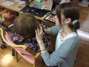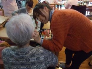 2014年11月12日(水)と11月19日(水)、老人ホームの和楽久日高ふるさと館を訪問して、メイクの資格を持つ学生がホームの皆様にメイクを行いました。最後にホームの方々の行っている亀の模型にお手玉を投げて乗せるゲームにも参加させていただきました。