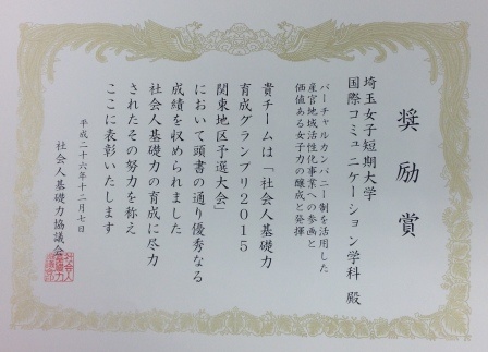2014年12月7日(日)、東京の拓殖大学を会場として行われた「社会人基礎力育成グランプリ2015 関東地区予選大会」で、本学の森川専門ゼミ(エアライン)が、短期大学としては唯一「奨励賞」を受賞し、先日表彰状が届きました。