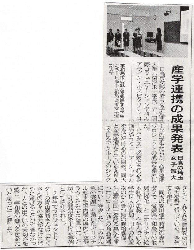 2/6の埼玉新聞に、エアライン専門ゼミ 卒業研究発表会が掲載されました 2015.02.09 エアライン専門ゼミ2年生の卒業発表が、埼玉新聞(2015年2月6日)に掲載されました。 産学連携先である、ANA総合研究所とのコラボレーションプロジェクトの成果を発表している模様が取り上げられています。 一覧へ戻る