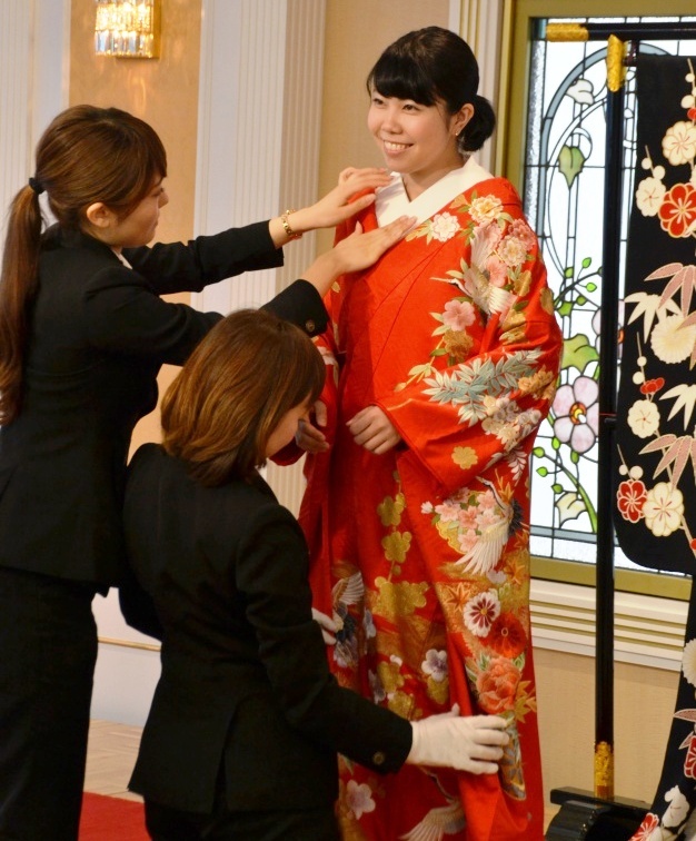 当日は、ブライダルスタッフによる施設案内の他に、SAIJO卒業生による講話、ブライダルスタッフとの懇親、和装の着付け体験を行いました。ブライダル業界に就職した先輩方の体験談を伺い、白無垢や色打掛の着付けを体験することもできました。
