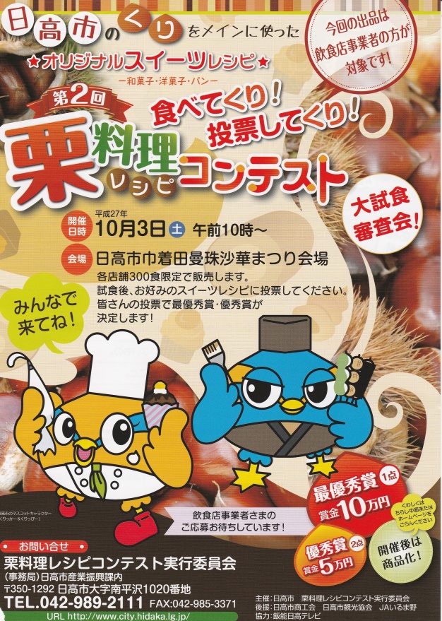 10月3日(土)の10時からは、巾着田曼珠沙華祭り会場にて栗レシピコンテストの試食審査会が催されます。ぜひお越しください。