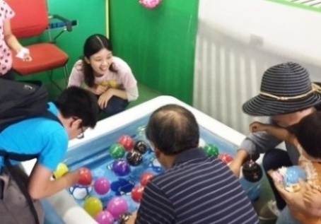 たくさんの屋台やゲームコーナーがある中、SAIJO生が担当するのは縁日。輪投げにスーパーボールすくい、水風船釣り、ボール投げ、特大お絵かきの進行を務め、400人を超える子供たちを楽しませていました。