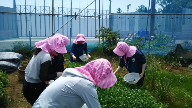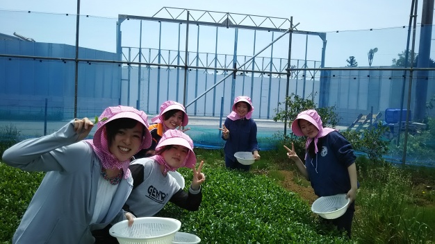 学生達はお揃いのSAIJOピンクの農業帽子を被り、一所懸命にきらきら輝く茶葉を摘み取りました。