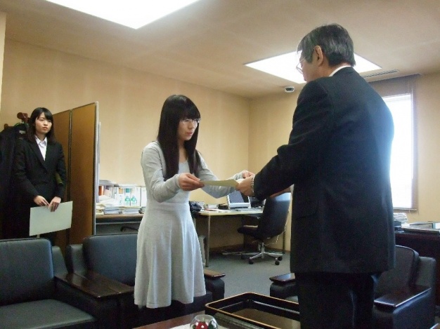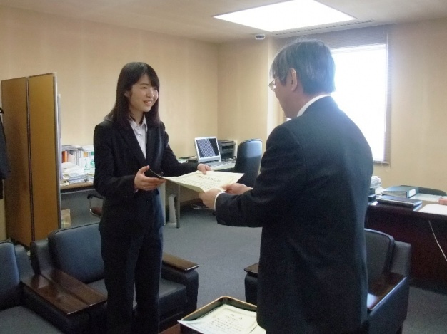 2016年11月に行われた医療秘書教育全国協議会主催の「第57回医療秘書技能検定」、「第42回医事コンピューター技能検定」の成績優秀賞を、本学から3名の学生が受賞し、2017年1月25日(水)に学長室にて、桾沢学長より表彰状が授与されました。
