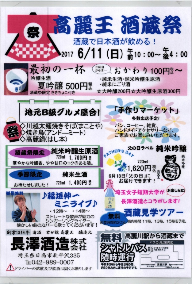 2017年6月11日(日)に日高市唯一の酒蔵である長澤酒造の「高麗王・酒蔵祭」に出店します。