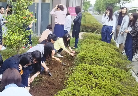 6月吉日、エアライン・ホスピタリティコースの1年生とエアライン専門ゼミの学生が協力して植えた球根からかわいい🌱が出ました。