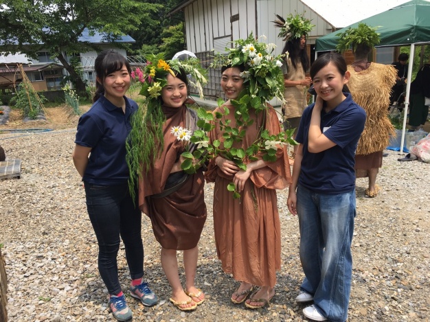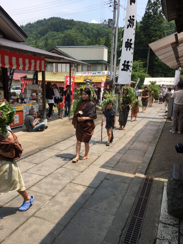 一つ目は、町の人々に昔から親しまれている「大山祇神社」(オオヤマヅミジンジャ)の祭事期間中、西会津町に自生する草花を花飾りとして頭にあしらい、自然の恵みに感謝する「草木をまとってやまの神」というパレードに参加することです。