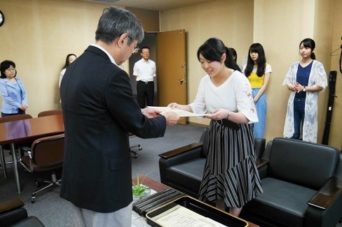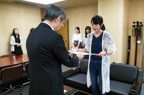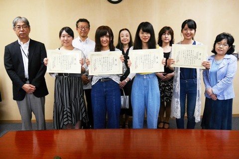 2017年6月に行われた医療秘書教育全国協議会主催の「第58回医療秘書技能検定」の成績優秀賞を本学の2年生4名が受賞し、2017年8月2日(水)に学長室にて、桾沢学長より表彰状が授与されました。