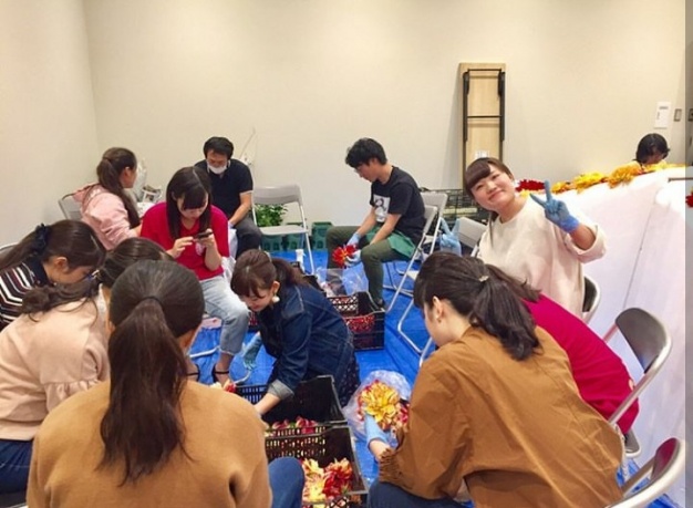 前夜の準備から塙町の方々や、山形県のダリア産地の皆さん、また、日本ダリア協会のスタッフの皆様と、会場となった噴水広場の巨大なダリアのオブジェを製作する準備に取りかかりました。