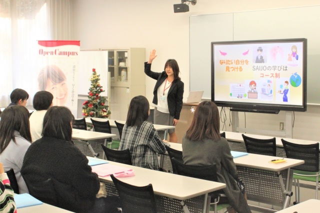 「全体説明会」はSAIJOならではの特長を知ることができます。SAIJOの2年間が分かる学校紹介!SAIJO生からSAIJOに決めたきっかけや入学後の話が聞けるSAIJO生スピーチ!SAIJOの学生生活が見れるキャンパスライフビデオ!オープンキャンパスに来たからこそ分かるSAIJOの良さを発見してみてください。