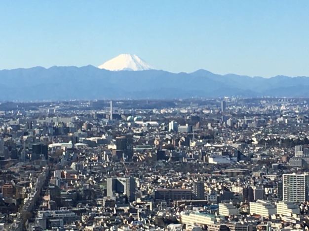 2階のエントランスから最上階に上がり、エレベーターの扉が開いたとたん、目の前にまぶしい光があふれる明るいフロアが広がり、その先には東京が一望できる絶景と雪を頂いた富士山が青空をバックに輝いていました。その素晴らしい景色に一同感嘆の声がもれます。