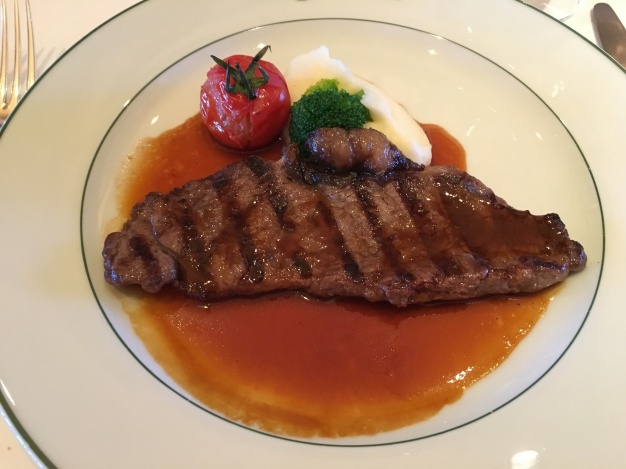 スモークサーモンの前菜、サーロインステーキ、そしてチョコレートケーキはどれも洗練されたおいしさで、皆笑顔がこぼれます。もちろん、サーブしてくださる方の手元からも目が離せません。スプーンとフォークで器用にミニバゲットをサーブしていただくと、「あれ、授業で習ったけど難しいんだよね。」というささやき声も聞かれました。
