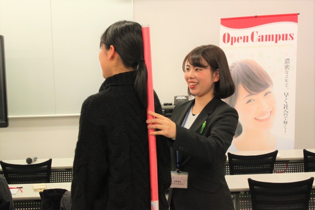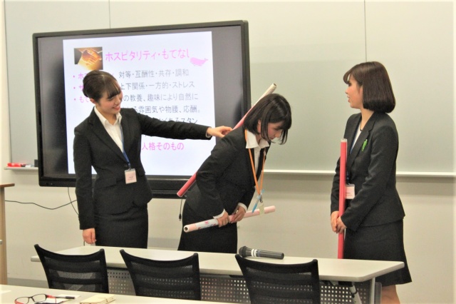 今回は、憧れの業界で活かせるSAIJOスタイルのマナー&ホスピタリティを体験してもらいました。まずはSAIJO生が2年間で身につけた綺麗なお辞儀を披露!その後、高校生にもSAIJOオリジナルのSAIJO棒を使って、実際に正しいお辞儀を体験してもらいました。