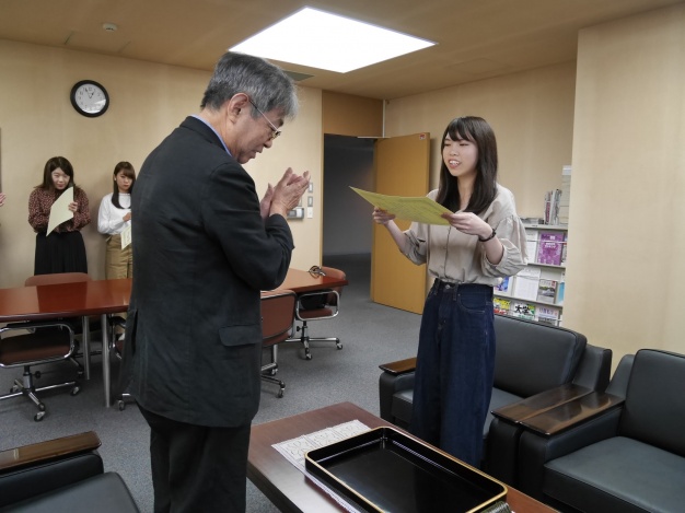2018年6月に行われた、医療秘書教育全国協議会主催「第60回 医療秘書技能検定試験」および「第45回 医事コンピュータ技能検定試験」の結果において、成績優秀賞を受賞した学生に、2018年9月21日(金)学長室にて桾沢学長より表彰状が授与されました。