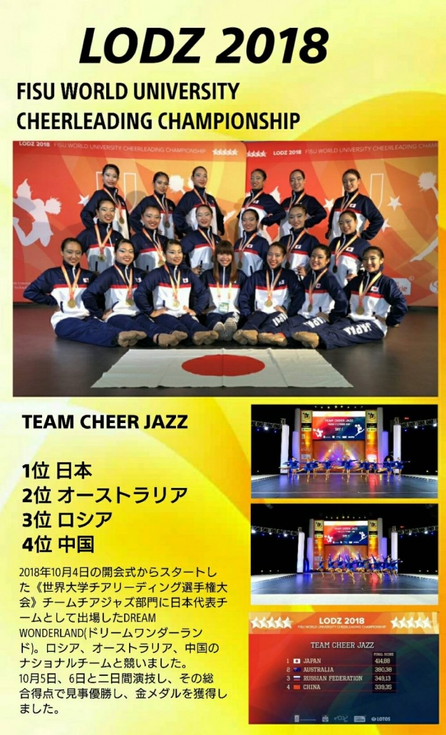 2018年10月4日から6日にかけて、ポーランドのウッチにて開催された「国際大学スポーツ連盟」主催の「第一回世界大学チアリーディング選手権大会」に、日本代表チアダンスチーム”DREAM WONDERLAND”に本学学生の木村真帆さん(商学科2年)、浅井彩乃さん(国際コミュニケーション学科1年)の2名が選抜され、出場しました。