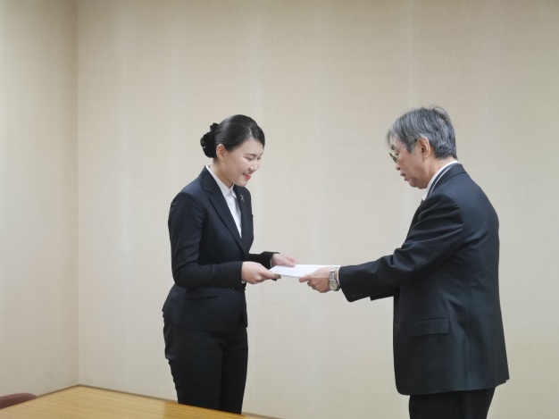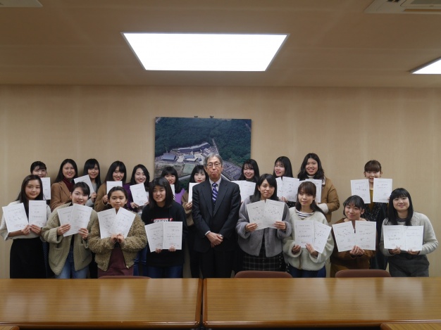 この資格は、旅行会社が企画するツアーや団体旅行に同行するツアーコンダクターに取得が義務づけられており、国内旅行のみ添乗できる「国内旅程管理主任者」と海外旅行の添乗も可能な「総合旅程管理主任者」の2種類があります。本学では、旅行会社に就職を目指す学生の皆さんを対象に対策講座を設けており、多くの学生の皆さんが資格を取得することができました。桾沢学長から一人ひとり表彰状が授与され、皆さんとても嬉しそうな笑顔を見せてくれました。今後も勉学に励み、より一層の活躍を期待します。