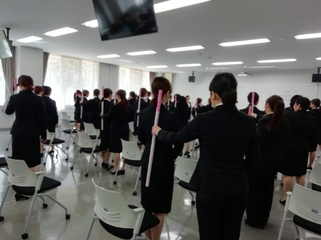 まずは、SAIJO名物【SAIJO棒】を使ってのお辞儀の特訓です。
