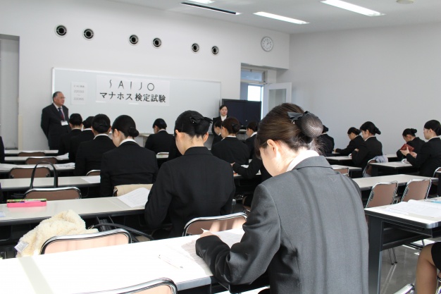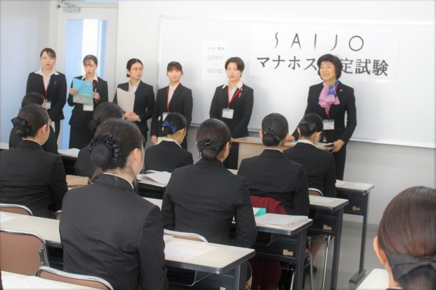 2月6日、第2回SAIJOマナホス®検定試験が行われました。この検定は埼玉女子短期大学マナー・ホスピタリティ研究所が独自に実施している学内検定です。「マナーとホスピタリティⅠ・Ⅱ」で学んだ「心の美人」「マナー美人」の精神と知識を理解し、身だしなみや立ち居振る舞いとして実際に表現できる力が求められます。