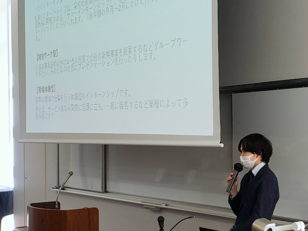インターンシップの種類や探し方、就職活動の準備など、1年生の内から準備すべきことをお話しました。
