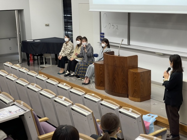 なぜその企業に決めたのか?就職活動はいつ始めて、どのような対策をしたのか?実際に働いてみて大変なこと、やりがいに感じることは?等、HPでは知ることのできない貴重な生の声を聞くことができました。最初は「先輩かわいい!」とざわざわしていた1年生も、就職活動の話になると真剣に耳を傾けていました。