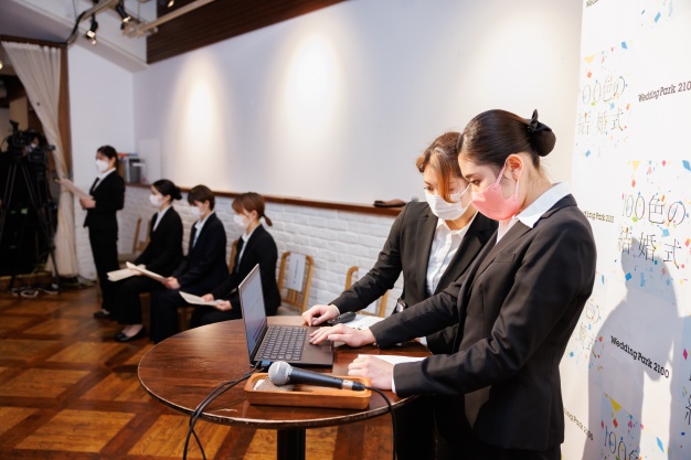 登壇者の芥川賞作家でお笑い芸人の又吉直樹さん、ブライダルファッションデザイナーの桂由美さん、株式会社ウエディングパーク代表取締役の日紫喜さんに向けて発表しました。(全文は下記URLよりご覧いただけます)