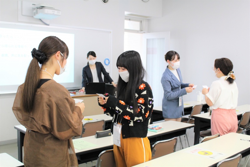元ANA客室乗務員の先生が教える「誰もが憧れるオフィスレディの姿とは」では、好感をもたれる第一印象の与え方やビジネスの基本である名刺交換をSAIJO生と一緒に楽しく体験していました。