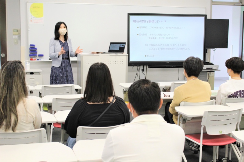 「観光がさらに楽しくなる観光ガイド」では、コロナ禍に観光関連業界が打ち出している観光促進事業や変化する観光業界でも必要不可欠な観光の基礎知識について自身の観光業界での勤務経験を元にお話ししてくださいました。
