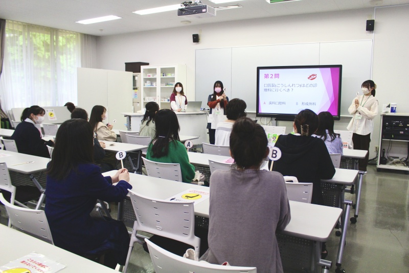 医療事務や調剤薬局事務コースに所属するSAIJO生が病院受付のロールプレイングや知っていると安心な医療関連の豆知識をクイズ形式で紹介しました。普段、授業で使うテキストや勉強方法などSAIJO生にしか伝えられないエピソードを聞くことができました。