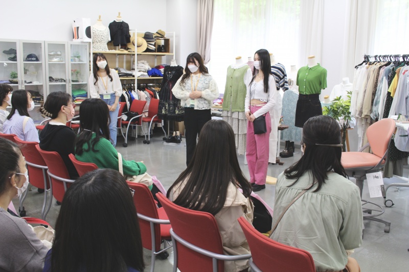 今季のトレンドを取り入れたファッションコーディネートにあわせて、こちらもトレンドのメーク術を実演してくれました。勉強した色彩感覚やスタイルアップする魅せ方、ビューティーアドバイザーの基本など随所に専門スキルを散りばめていました。