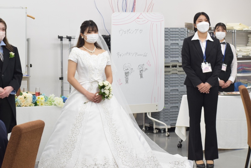 披露宴会場風にセッティングされた教室で、進行にあわせてウェディング衣裳、バンケットサービスを披露していました。限られた時間のなかで、SAIJOで学んでいる知識をたくさん伝えたいというSAIJO生の想いが伝わる発表でした。