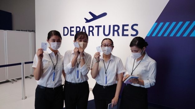 学生達は、ANAの歴史が映し出された巨大な画面があるエントランスから「DEPARTURE✈」のゲートを通って、さながら、飛行機に搭乗するように施設内に入りました。