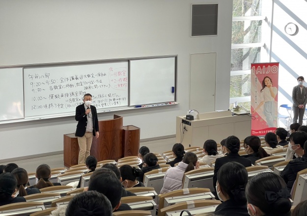 まず大教室に集まり、外部講師の先生方より面接で大切なことや入退室のレクチャーを受けました。そこでは学生同士ペアになり、「好きな食べ物、嫌いな食べ物」を想像するワークなどアイスブレイクを行い、緊張をほぐしていきました。