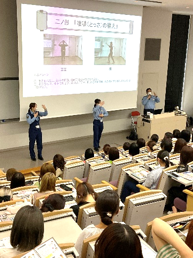 後半には「咄嗟の構え」「腕抜き」「ポン抜け」などの数々の護身術をご披露いただき、代表のSAIJO生たちが実演する場面も。壇上で護身術を体験した学生たちは咄嗟の行動の難しさを痛感したようで、「普段から対策を考えていなければいけないのだとわかりました!」と、実感を込めた感想を聞かせてくれました。