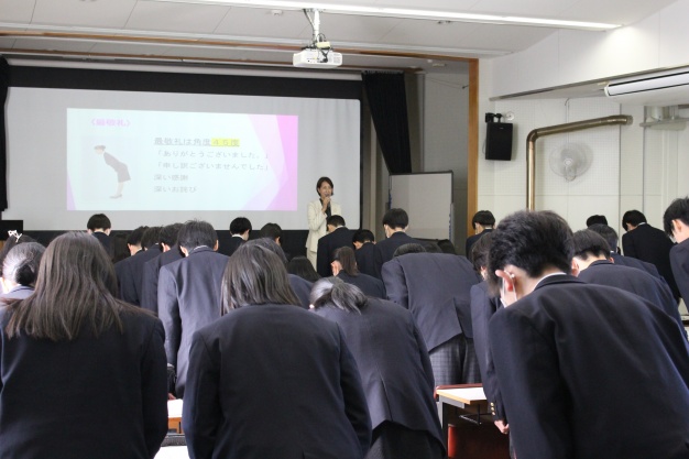 職場見学に参加される2年生の皆さんを対象に、「マナー・ホスピタリティ」について、社会に出てからも大切な「挨拶」と「立ち居振る舞い」について学び、最後に実習を行いました。