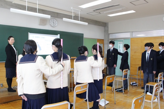 オリジナルの“SAIJO棒“ を使用して、会釈・普通礼・最敬礼の3種類のお辞儀をペアワークで実践しました。少々苦戦する生徒さんもいらっしゃいましたが、和気あいあいとした雰囲気のなか、お互いに声をかけ合いながら一生懸命取り組む姿は大変美しいものでした。