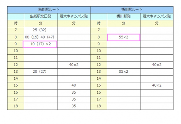 各バス停9時台(桶川駅発は8時55分)に発車する便に乗車し、お越しくださいますよう、よろしくお願い申し上げます。