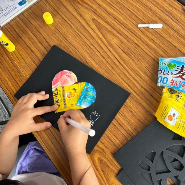 また、ステンドグラスに使ったラベルやキャップ、台紙の切り抜きは、SAIJO内の他のゼミ生の力も借りました。