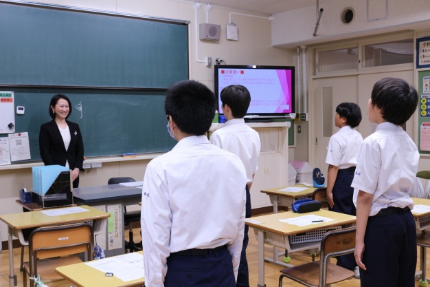 職場体験に行くにあたり、事前に社会人に必要なマナーや礼儀を学びたいというご依頼をいただき、鹿野研究員が出張授業を行いました。