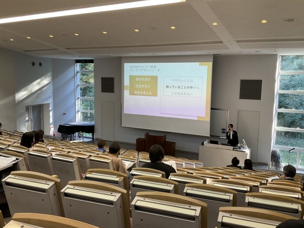 全体会では、学長の挨拶、企業講演、本学のキャリアサポート体制について、保護者の皆さまに説明させていただきました。