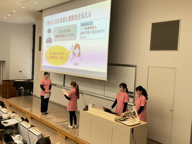 医療専門ゼミナール生が基礎ゼミⅡで「傷病者のための応急救護の仕方」を説明しました