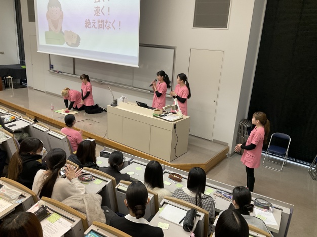 医療専門ゼミナール生が基礎ゼミⅡで「傷病者のための応急救護の仕方」を説明しました/トピックス|埼玉女子短期大学[SAIJO]
